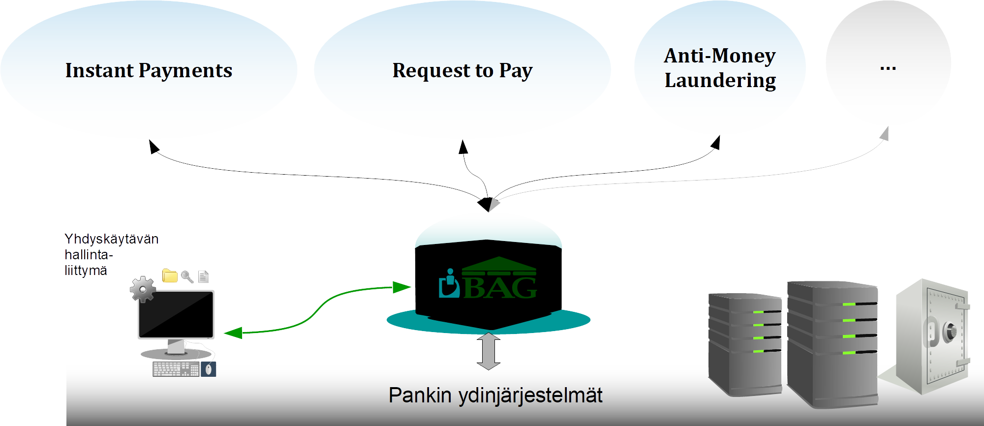 IDBAG:n avulla liittyminen pankkien välisiin pikamaksujärjestelmiin (IPS) ja tietoliikenneverkkoihin onnistuu yksinkertaisesti ja hyvin kustannustehokkaasti. Se on yhdyskäytävä pikamaksupalvelujen tarjoajien ja pankin omien sisäisten pikamaksutoiminnallisuutta toteuttavien järjestelmien väliin. Yhden yhdyskäytävän kautta on mahdollista kytkeytyä useisiin eri maksujärjestelmiin ja automaattinen reititys sekä sanomasisältöjen konversio tekevät palveluista läpinäkyviä, ilman tarvetta huomioida jokaisen eri rajapinnan yksityiskohtia sisäisten järjestelmien toteutuksessa. Pikamaksutapahtumien lisäksi samaa yhdyskäytäväarkkitehtuuria voidaan laajentaa kattamaan myös muita olemassaolevia tai tulevia pankkien sanomanvälitystarpeita, kuten Request to Pay (R2P).