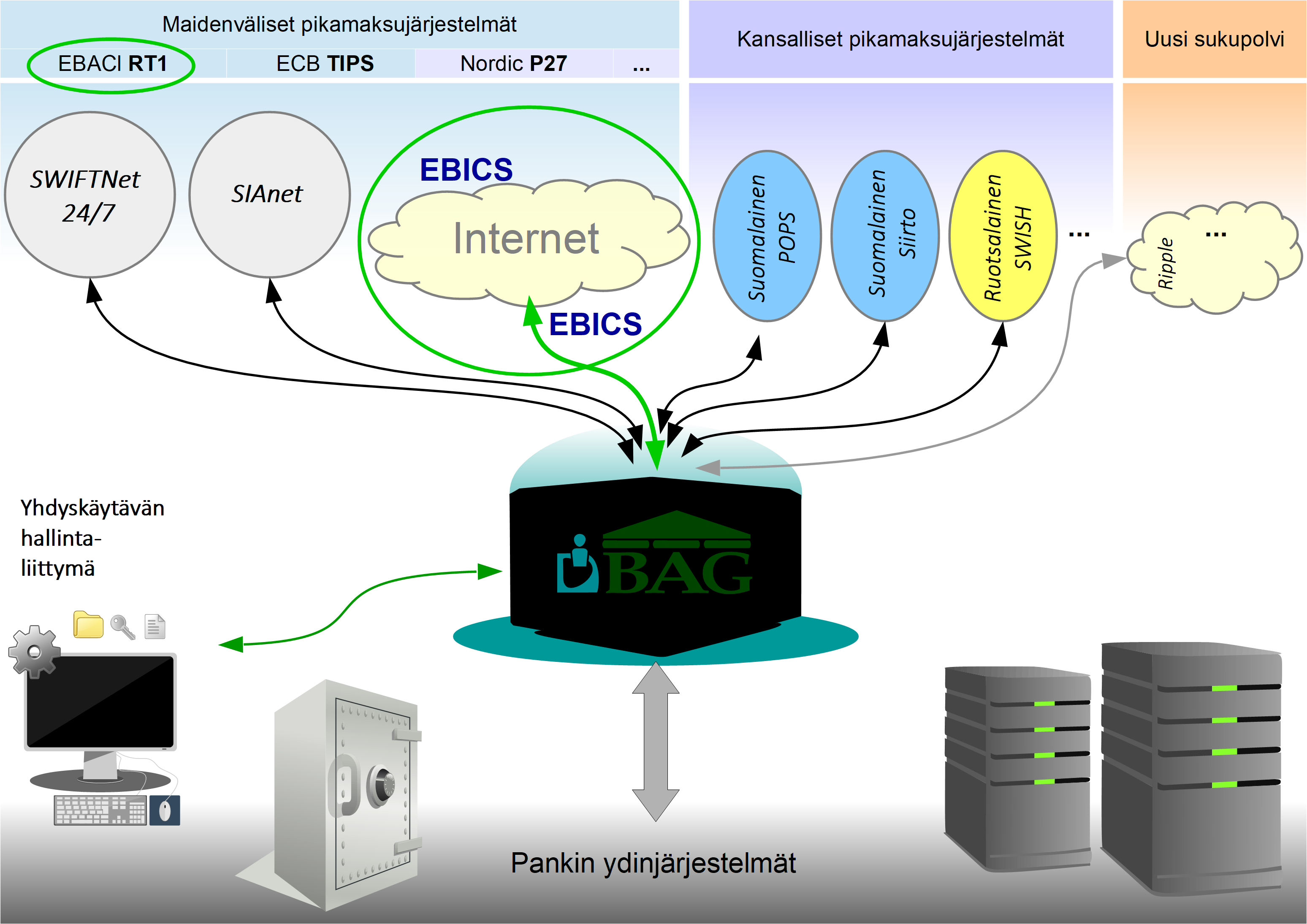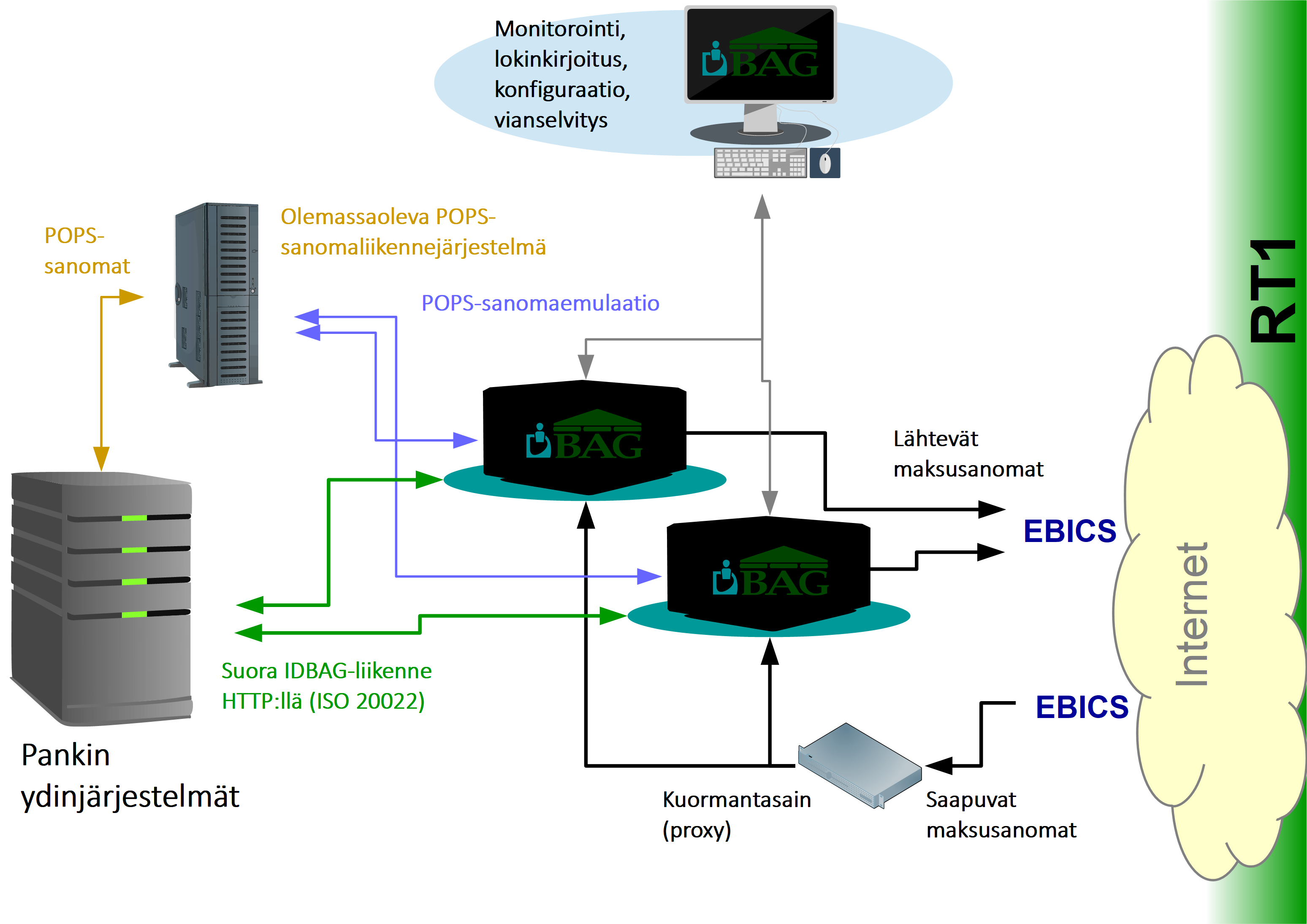 IDBAG-ratkaisun peruskokoonpano koostuu yhdyskäytäväohjelmistosta varustettuna sisäänrakennetulla tuella EBA Clearingin RT1 -pikamaksujärjestelmälle käyttäen EBICS-yhdyskäytäntöä joko julkisen verkon yli tai yksityisiä/VPN-linjoja hyödyntäen. EBICS – Electronic Banking Internet Communication Standard – on protokolla, joka on erityisesti kehitetty turvalliseen tapahtumapohjaiseen pankkien sanomaliikenteeseen turvattomien tietoliikenneverkkojen, eli julkisen internetin kautta. Se on myös suositeltu liityntätapa EBA Clearingin RT1-alustalle. EBICS-yhteyksien käyttö mahdollistaa hyvin kustannustehokkaan tapahtumaliikenteen, koska tällöin itse sanomaliikenteestä ei synny lainkaan kiinteitä tai tapahtumapohjaisia kuluja, vaan ainoastaan varsinaisen pikamaksupalvelun tarjoajan veloitukset. Julkisen verkon käyttö maksimoi myös sanomanvälityskapasiteetin suurien linjanopeuksien ansiosta. EBICS-käytännön rinnalla IDBAG voi hyödyntää maksutapahtumien reitityksessä myös liittymiä muihin verkkoihin, kuten SWIFTnet tai SIAnet.