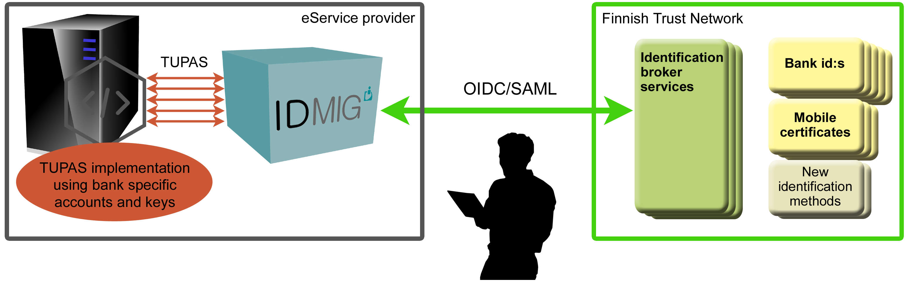 - Current bank-specific TUPAS customer id:s and security keys are configured for IDMIG, as well as account information and keys for the new identification protocols (Open ID Connect, SAML) for the selected identification broker service, or several of them.